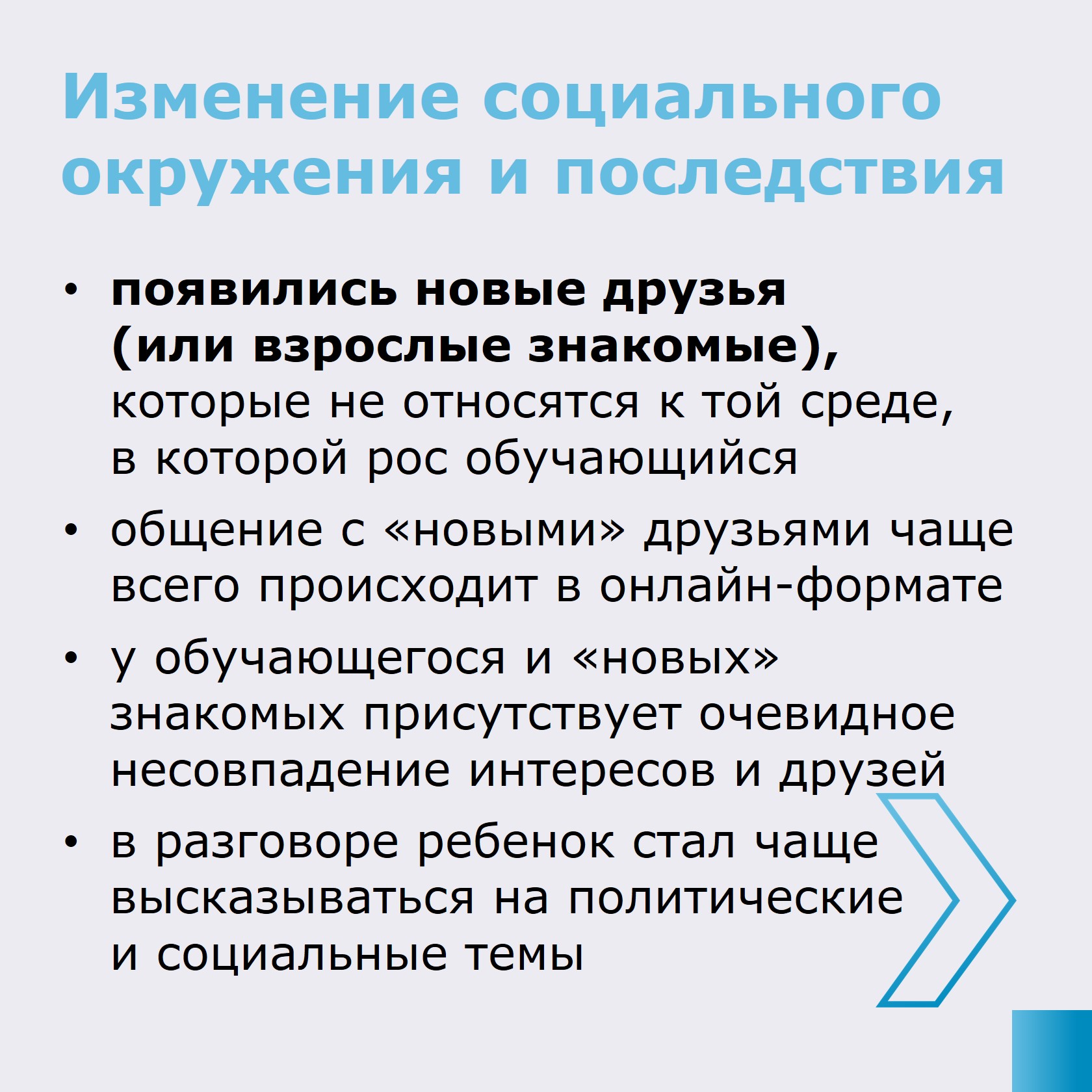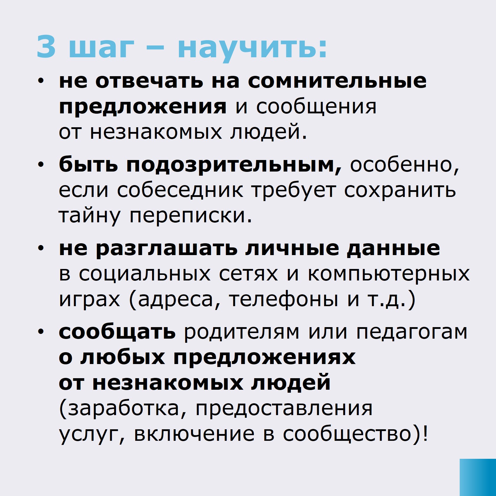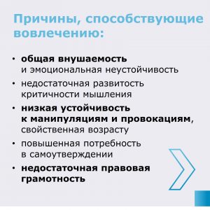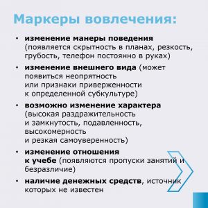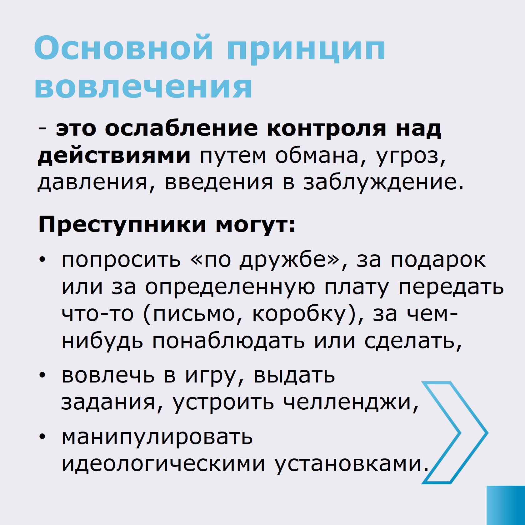 Основной принцип вовлечения: — это ослабление контроля над действиями путём обмана, угроз, давления, введения вы заблуждение. Преступники могут: — попросить «по дружбе», за подарок или за определённую плату передать что — то (письмо,коробку), за чем — нибудь понаблюдать или сделать — вовлечь в игру, выдать задания, устроить челленджи — манипулировать идеологическими установками.